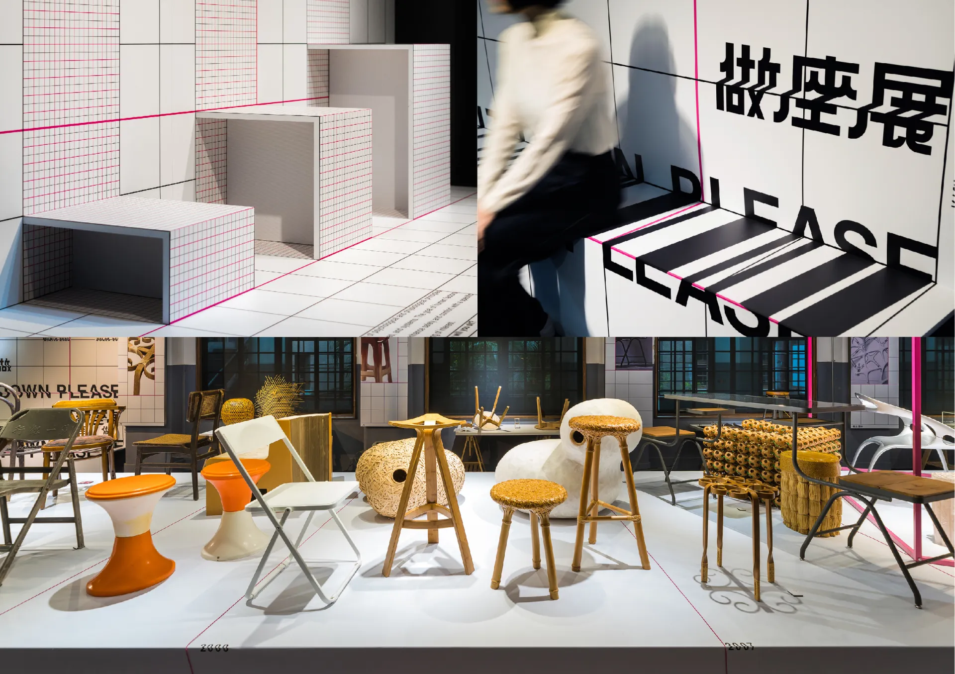 Grids and Site Down Please fonts throughout the exhibition forms the visual identity about the dialogue between graphic and object, the past and future of SIT and SEATS. The exhibition identity Fluorescent Pink line brings out the stroke of a Chinese character “坐” (sit), like the new blood for the chair design’s new generation. Vertical and horizontal three-dimensional objects can constitute a seat, the same as using different angles of lines to create the 26 English letters and Arabic numbers.