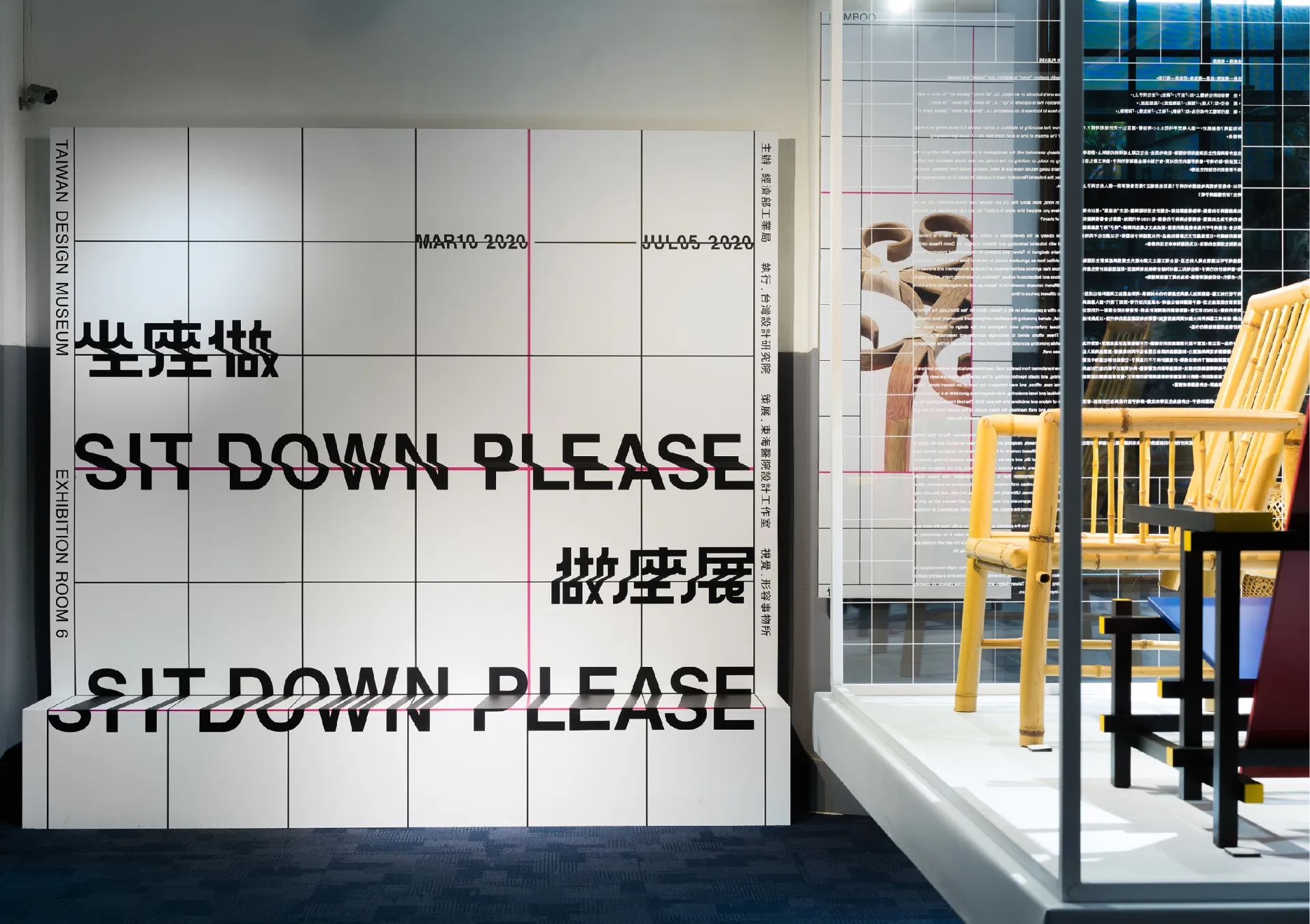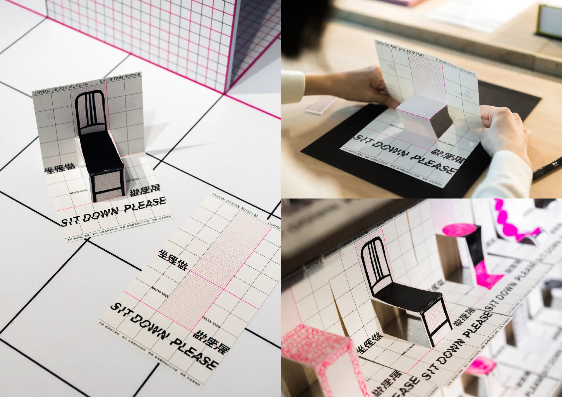 以圖學方格眼和椅子座位字體貫穿整體展覽視覺,展開平面與立體,過去與未來關於座椅的對話。方格眼中螢光桃紅識別帶出漢字「坐」字中筆畫的縱橫線條,如椅子歷史中的新血,畫出新時代觀展者的體驗。垂直水平可構成立體座椅的基準,也可加上線條與角度創造有摺角與透視的26個英文字母與阿拉伯數字的「椅子座位字體」,並運用到展覽指示標誌中的文字編排;讓字體結構延伸出座面功能,產生SIT DOWN PLEASE可坐下的想像可能。最後也將實體展覽特色呈現於可對摺的文宣上,提供觀者看完坐座做後,也坐下來自行創作做張座椅子,完整看展體驗、集體創做座椅的記憶。