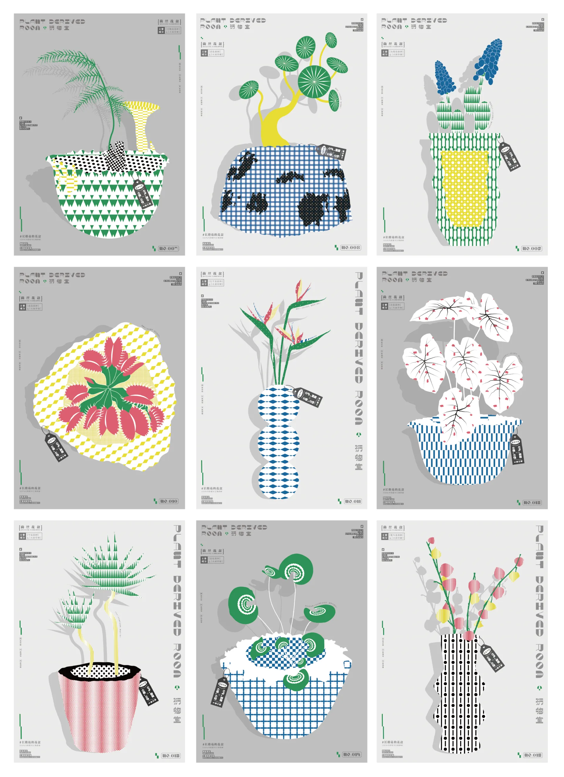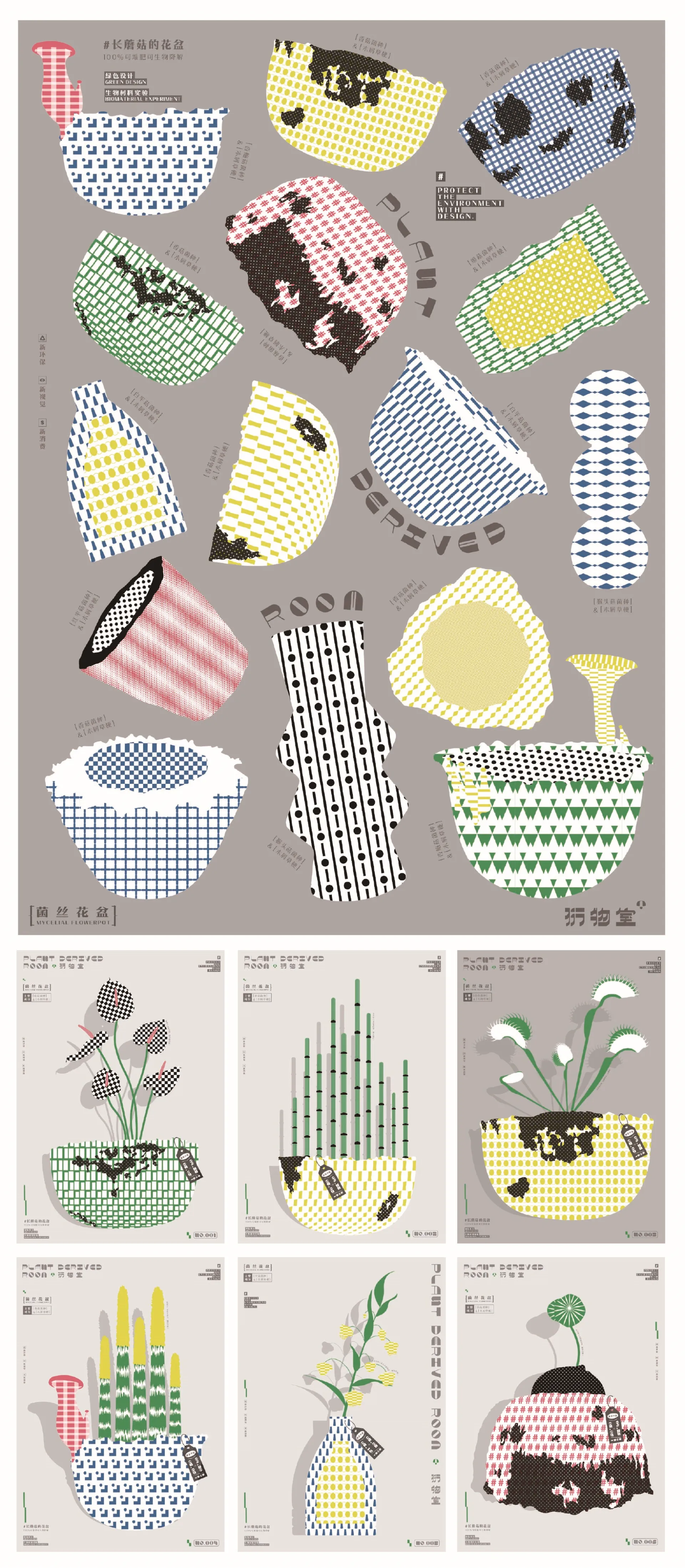 The work takes potted plants as the main carrier and uses (material made of fungi mycelium) biomaterials to make flower pots to realize green and sustainable design. The production process of flowerpot is simple and convenient. Raw materials such as bacteria, sawdust and forage can be obtained locally in rural areas. The logo, font, packaging, posters and other brand images of PLANT DERIVED ROOM and the visual language of promotion design are mainly extracted from mycelial potted plants and rural elements, and better bridge the rural culture with the contemporary urban youth culture through a certain degree of "experimental visual language" design method and dot printing.