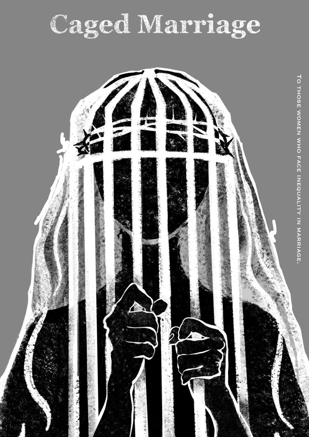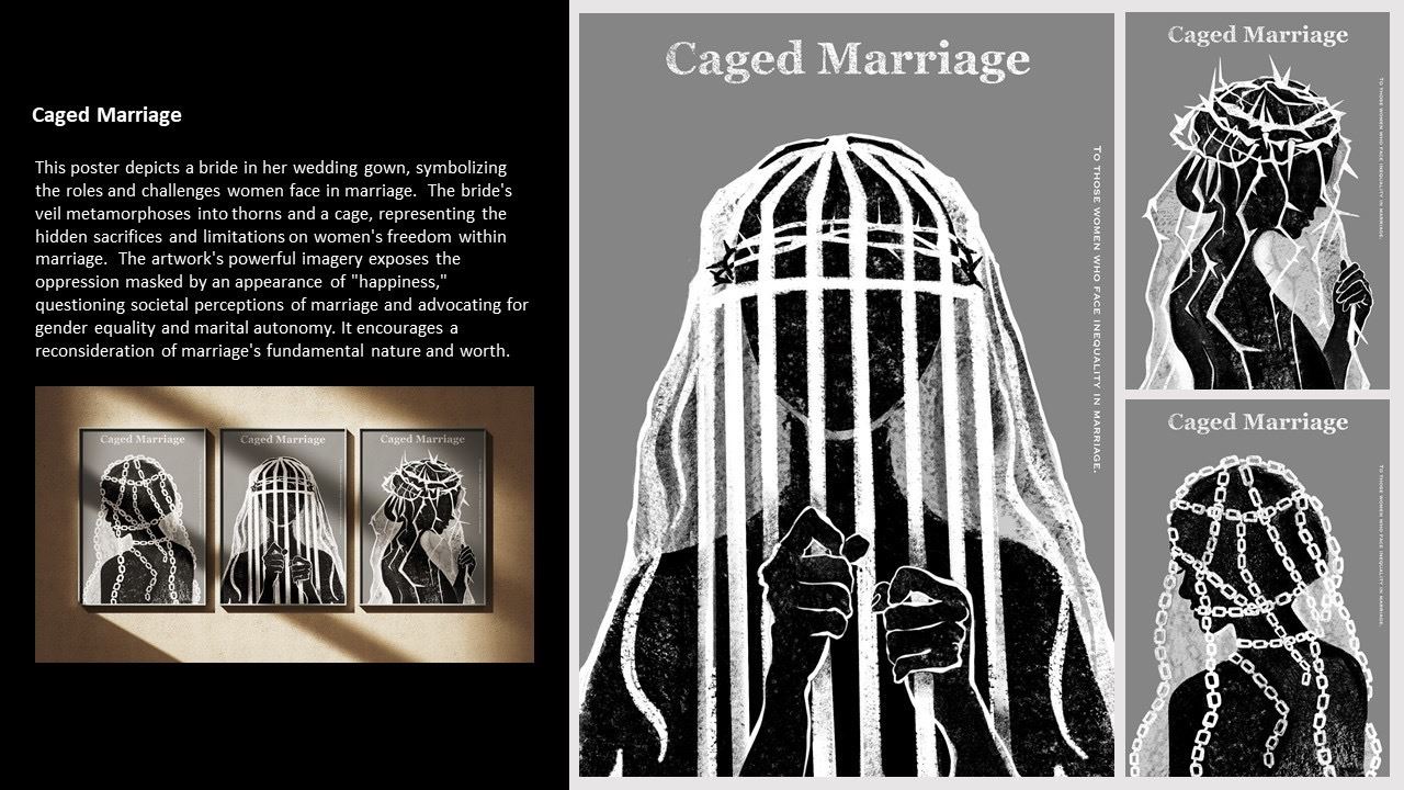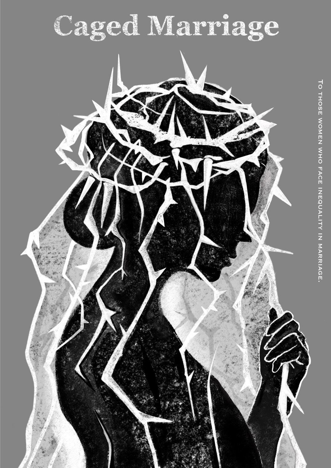 婚姻雖然有美好的一面,但同時也潛藏著女性在其中所面對的壓力與限制。畫面中,新娘身穿婚紗,象徵著社會對女性角色的期待與理想;然而,她的頭紗逐漸轉化為荊棘與牢籠,暗喻婚姻中看不見的犧牲與對自由的束縛。這件作品以強烈的視覺意象揭露了被「幸福」外表所掩蓋的壓迫,質疑社會對婚姻的普遍認知與價值觀,進而倡導性別平等與婚姻自主。它鼓勵觀者重新思考婚姻的本質與其真正的意義。