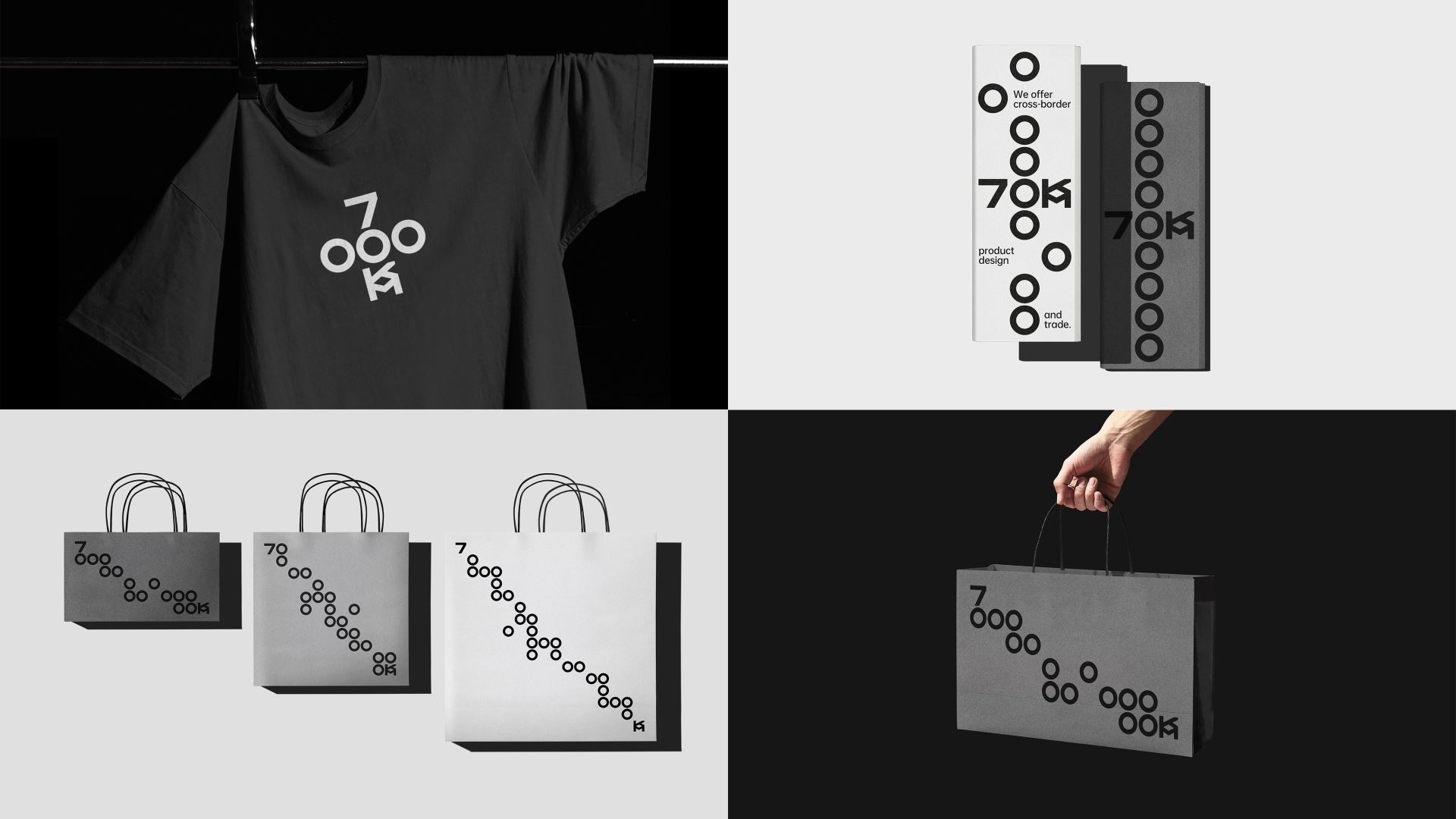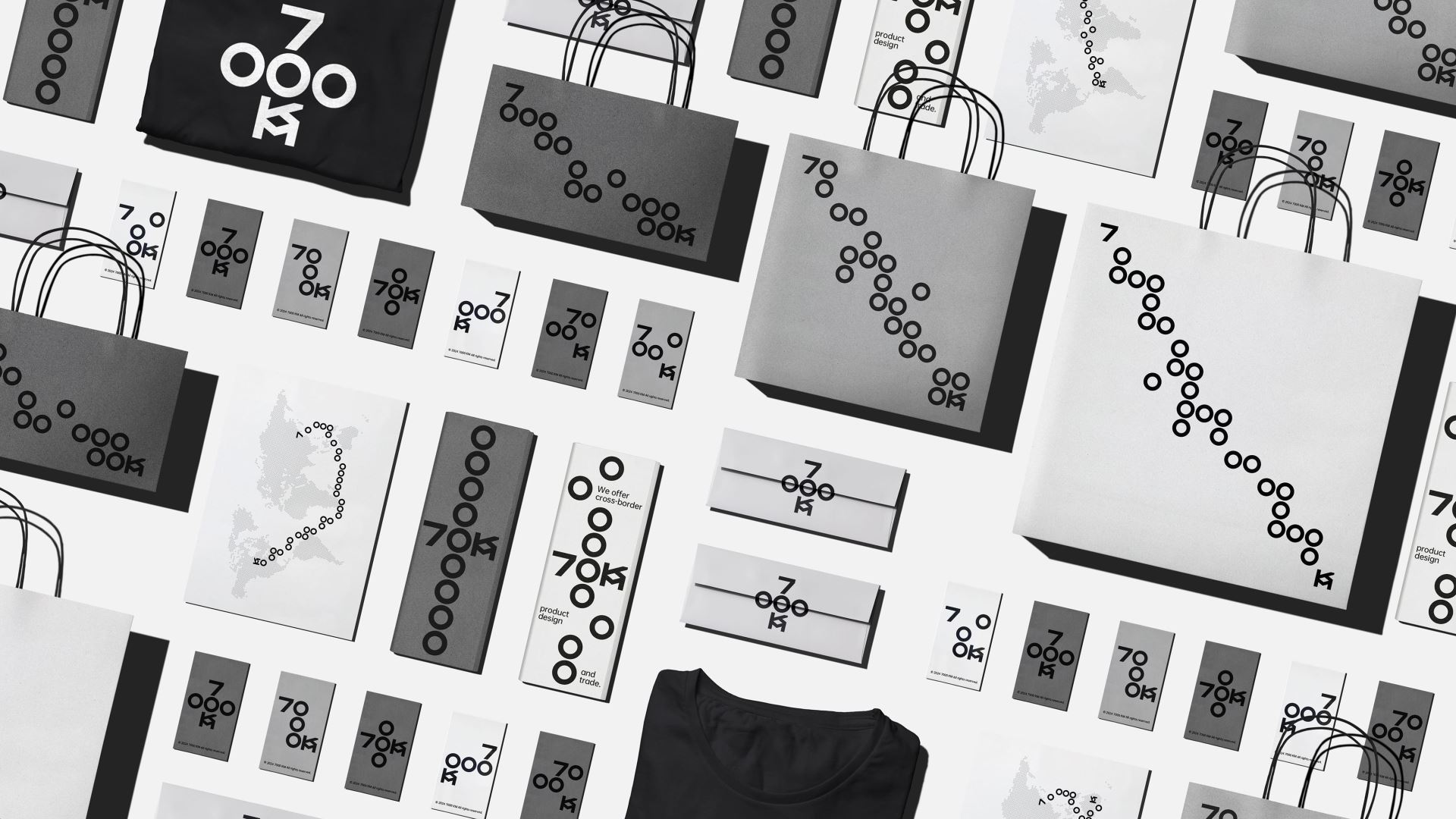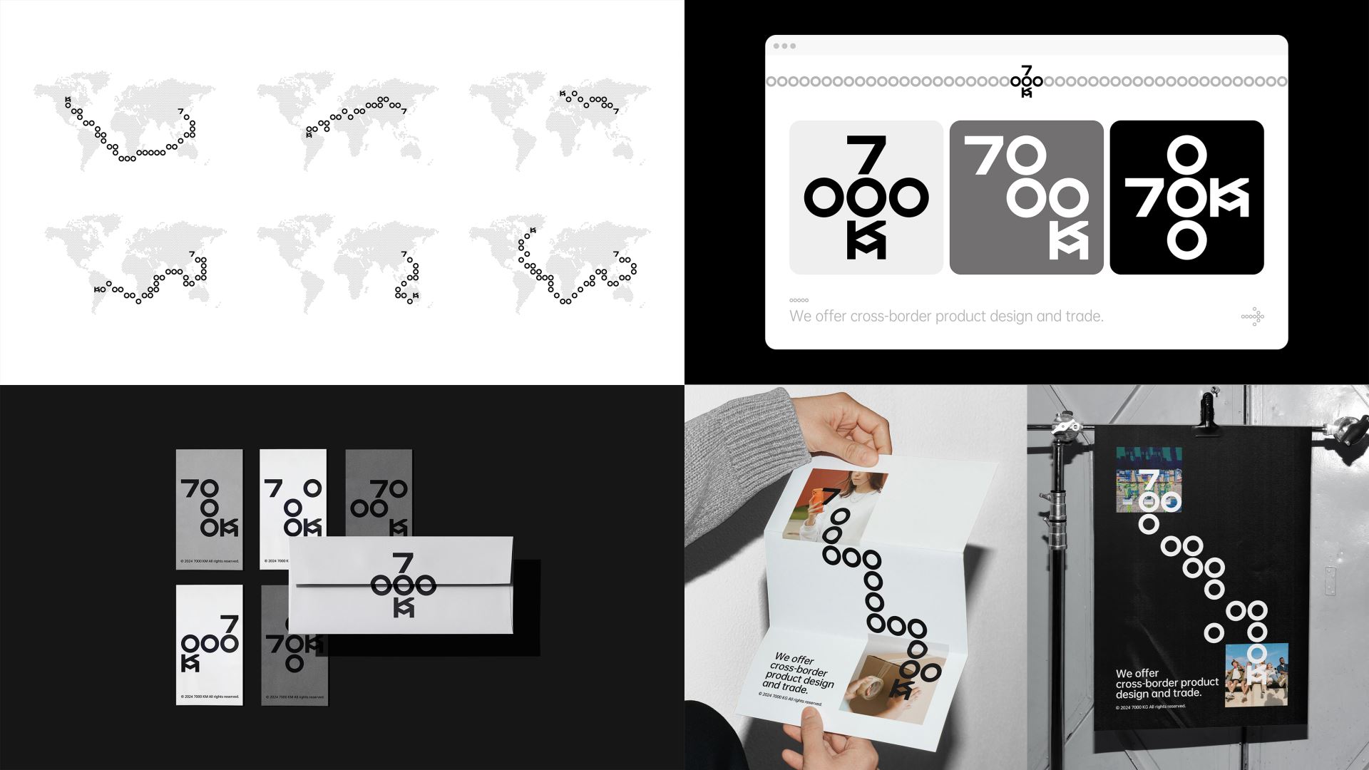 7000KM is a professional international trading company with operations in major economies such as America, Europe and Australia. Its name is derived from the total length of the Silk Road, the world's earliest international trade route. Our understanding of international trade and the Silk Road is that it is free, flexible, and friendly like a network spreading out, so we created a logo and visual identity for 7000KM based on a grid system. 7000KM's letters are condensed into a 5×5 grid, arranged and shuttled under the rules, so that the logo becomes dynamic and interesting, echoing the freedom and flexibility of the trade network. At the same time, the number 0 can also be extended into a "map route" representing trade and the silk road, linking from a starting point (the number 7) to an end point (the letter KM), which strengthens the impression of the brand, enriches the brand's emotional attributes, and helps the brand to develop more quickly.