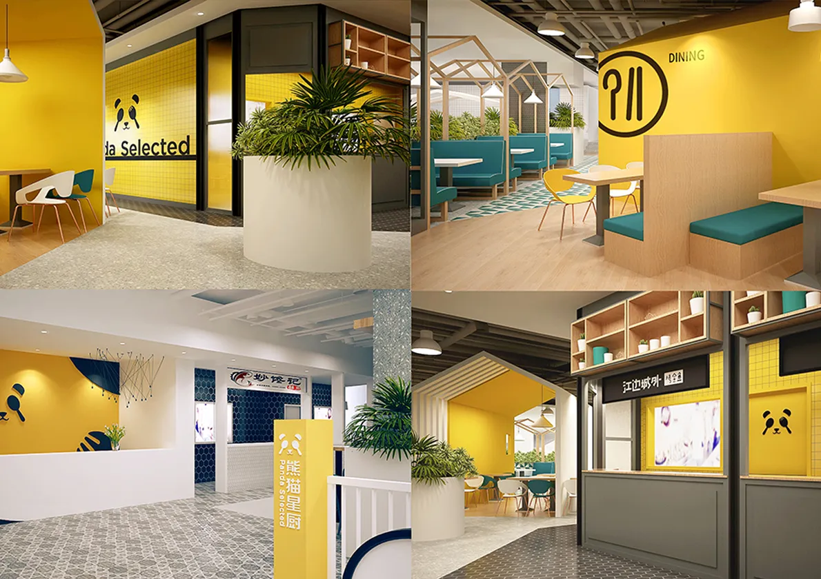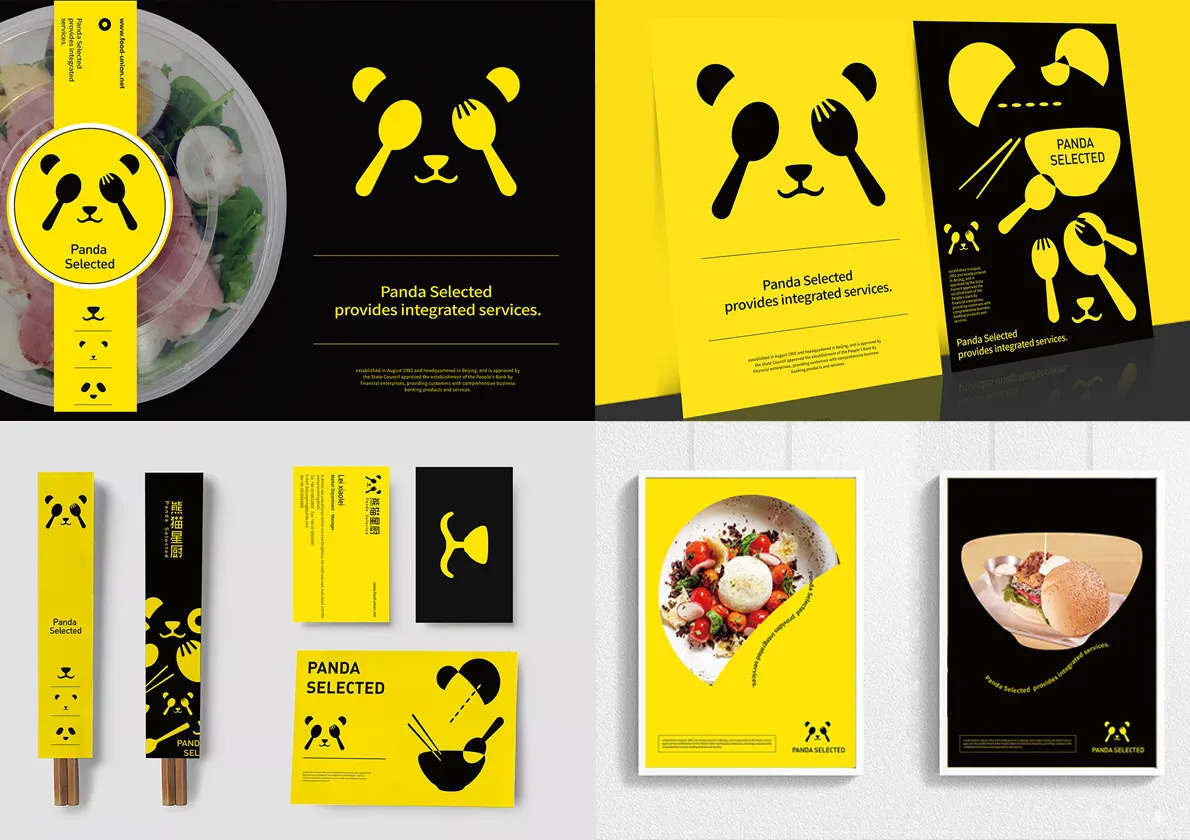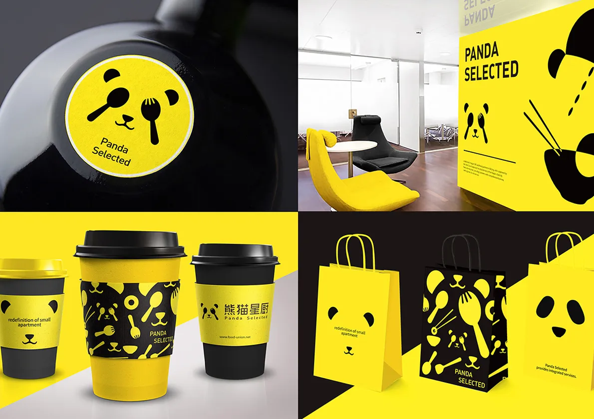Panda Selected is a WeWork model of catering industry, dedicated to catering brand incubation and site operation services, providing catering merchants with integrated solutions such as kitchen rental, online operation, market promotion, etc. It also has its own catering plate, which has been commercially laid out in Shenzhen, Shanghai and Beijing. The original logo scheme has been registered, with traditional text and graphics collocation, and many details are defective. With a complete VI system, we provide Panda Selected with brand diagnosis, brand logo promotion, brand visual overall planning and design, brand interior space design services. Panda Star Kitchen logo is too trivial, the text and logo are not matched properly. We upgraded and planned the whole brand image system. The combination of panda and kitchen elements is the core of the visual system, which enhances the panda portrait. We use this as the core to extend the panda image. We abandon the black and white colorless sense in tone, match yellow and black, so that the whole brand vision is more eye-catching and has. Appetite, the interior space combines the characteristics and elements of VI, and the use of materials and soft clothing is just right.